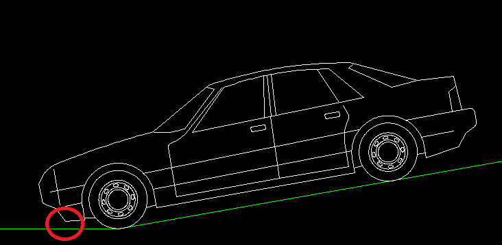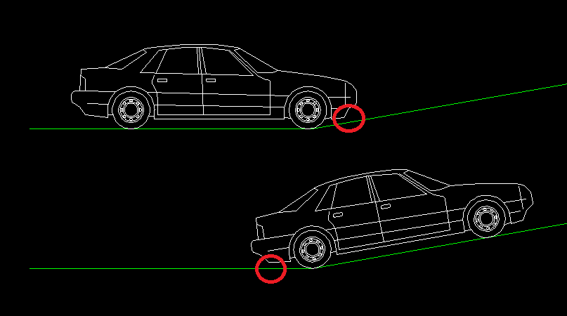 Ini titik kritis kedua, dimana harus dipastikan ketika mendarat pada basement, bamper mobil tidak menyentuh lantai. Kemiringan yang terlalu tinggi bisa mengakibatkan hal ini. (Lihat tanda merah)