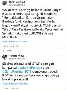 Eh simpatisan2 tolol, STOP colongan kampanye #Jokowi2Periode atau #GantiPresiden2019 dompleng tragedi BOM ini, ini musuh bersama siapapun yg bakal jd presiden!!!