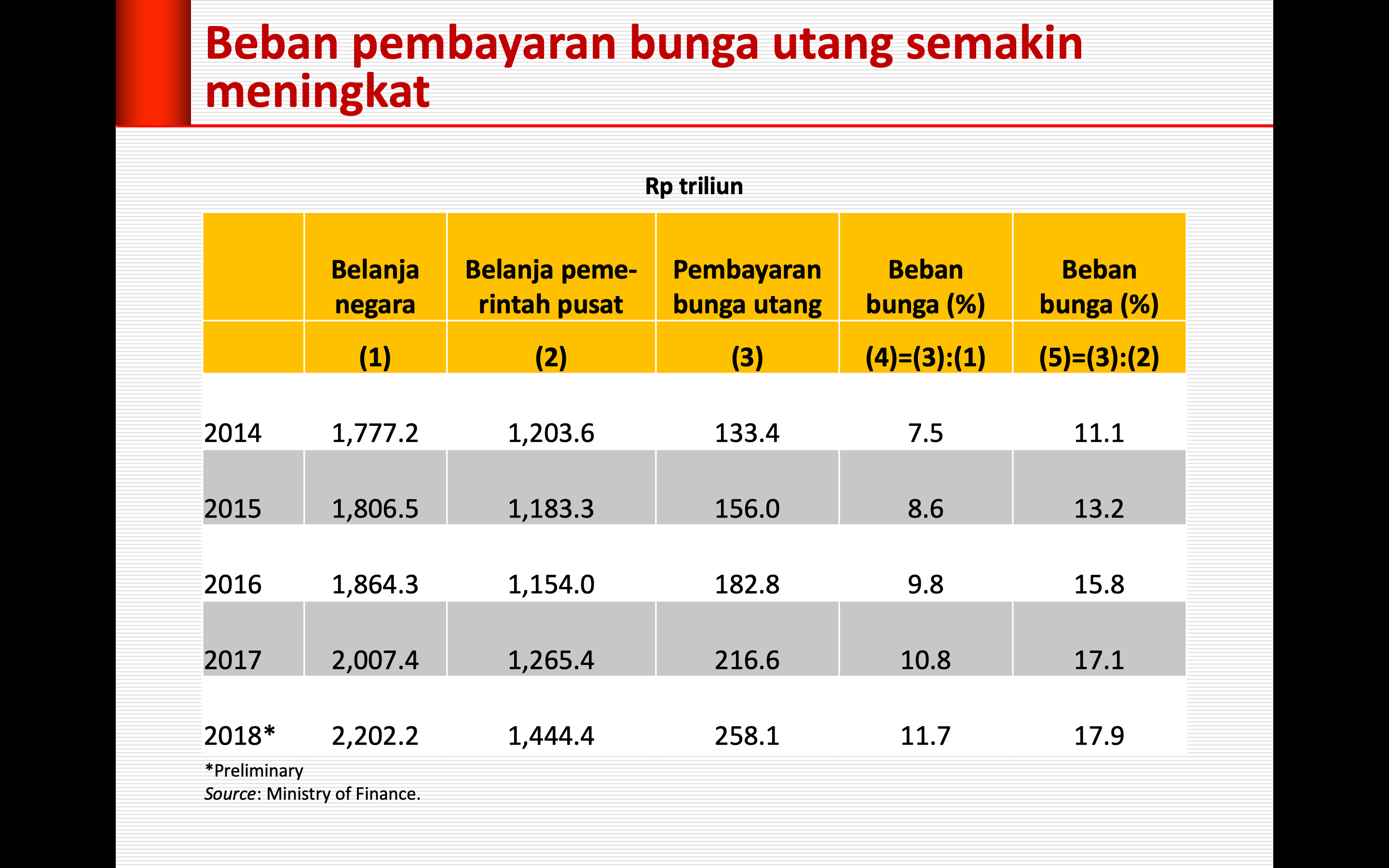 Pada tahun 2014, pembayaran bunga utang baru mencapai 7,5 persen dari belanja total dan 11,1 persen dari belanja pemerintah pusat. Lima tahun kemudian meningkat masing-masing menjadi 11,7 persen dan 17,9 persen.