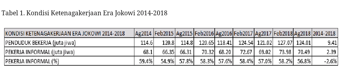 Lapangan Kerja di era Jokowi memang terus meningkat. Perlu diapresiasi bahwa selama 4 tahun (Agustus 2014-Agustus 2018), terjadi pertambahan penduduk bekerja sebanyak 9,4 juta jiwa. Sepertinya ini adalah salah satu janji Jokowi yang dapat terpenuhi hingga di akhir masa jabatan (Jokowi janjikan penciptaan 10 juta lapangan kerja dalam 5 tahun).