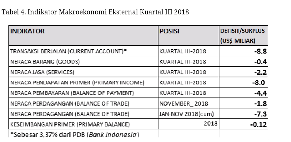 Mayoritas indikator eksternal makroekonomi berada pada posisi negatif. Selain dari indikator pendapatan sekunder, seluruh indikator: transaksi berjalan, neraca perdagangan, pendapatan primer, neraca barang, neraca jasa, keseimbangan primer; pada kuartal III-2018 berada pada posisi negatif.