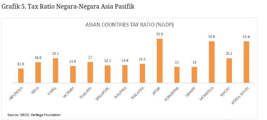 Besaran penerimaan pajak terhadap PDB, tax ratio, Indonesia sebesar 11,6% (definisi luas, memasukkan PNBP SDA) termasuk yang terendah di kawasan Asia Pasifik.