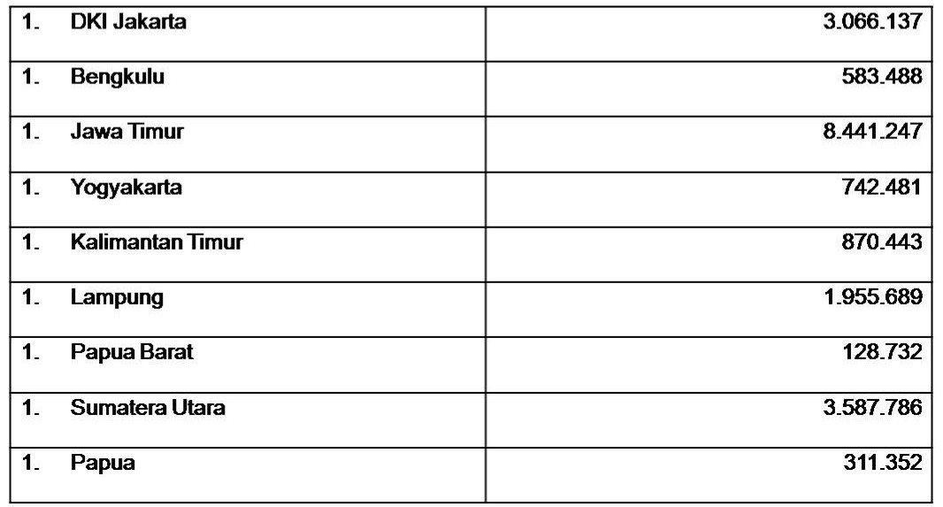 “Ada Sembilan (9) Provinsi yang terdata mengalami pengelembungan suara untuk paslon 01 Jokowi-Ma’ruf Amin, yakni DKI Jakarta, Bengkulu, Jawa Timur, Yogyakarta, Kalimantan Timur, Lampung, Papua Barat, Sumatera Utara, dan Papua. “papar Tonin.