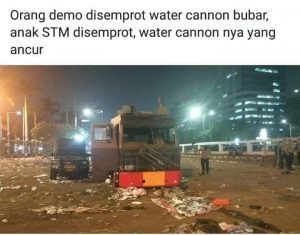 #Taktis-strategis#. Entah darimana kebisaan mereka menangkal serangan polisi. Tapi jelas mereka ‘know what they are doing’. Memancing polisi menembakkan gas air mata, dan dengan refleks melemparnya balik ke arah polisi. Semprotan air mereka sambut seperti pesta, “gua mau air! Gua mau air! Sini tambah!” teriak mereka kepada polisi. Setelah beberapa lama polisi kehabisan air dan amuinisi, giliran mereka menyerang. Polisi mundur dan terkurung di apartemen Semanggi. Komandannya berbicara di airphone minta damai.